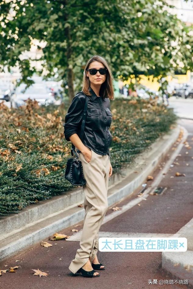 虽说裤子剪一刀称得上是拉腿神器,但不代表你有腿任性。太长的裤腿可以让裤子剪一刀的效果一下回到解放前。因为过长的裤脚会在脚踝或脚面盘踞,腿部线条得不到延伸,裤子开衩效果不大。