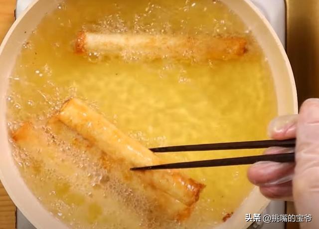 热油锅,约摄氏170度左右放入香蕉卷炸至金黄酥脆即可起锅。