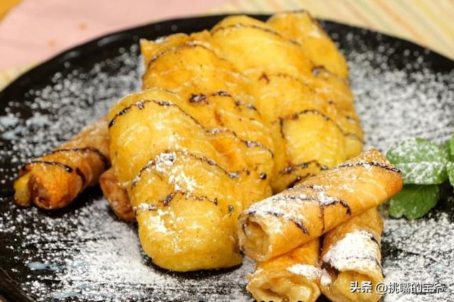 香蕉 2根/薄荷叶 2根/细砂糖 30克/蜂蜜 5克/春卷皮 4张/酥炸粉 50克/糖粉 适量/炼乳 适量/巧克力酱 适量/高筋面粉 10克
