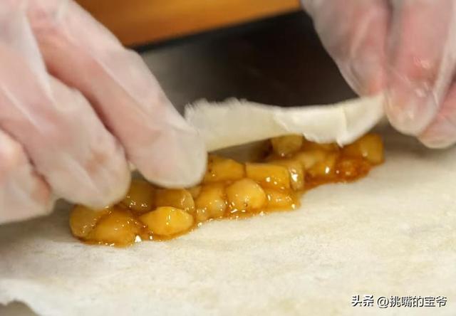 然后,再取春卷皮平铺后,中间放入适量香蕉馅卷起。