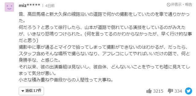 很久以前,我开车经过高田马场和新大久保的铁路沿线道路时,发现有拍摄团队,因为想知道他们在干嘛,所以我放慢了车速。我看到山本躺在路上表演,突然他对我大喊。(我听不清他在说什么,但我认为大意是 “快点走”)。我明白,如果拍摄时有汽车经过,麦克风就会接收到,导致无法拍摄,但如果是这样的话,他和工作人员就不应该在这样的地方拍摄,或者使用非记录的录音。从那时起,我就不看他的任何节目了,他本人也让我感觉很不好,因为无论他做什么好事,看起来都像是在撒谎。日常一些小事的累积和在日常工作中的平常的人性都很重要。