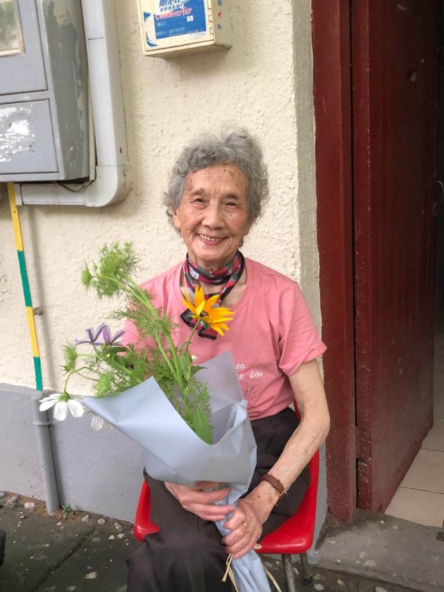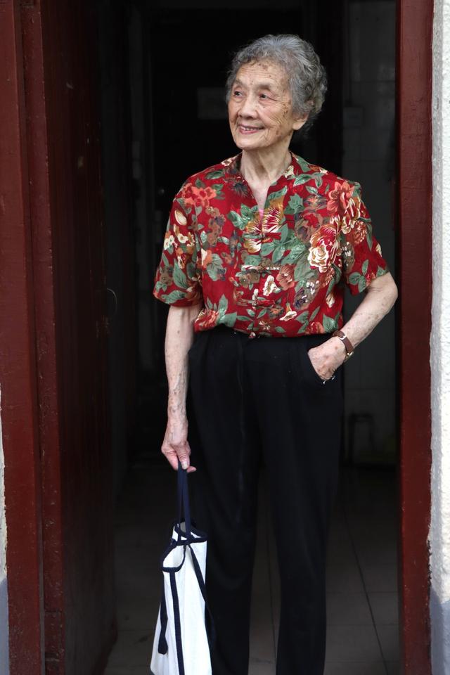 像这位奶奶的印花衬衫就是通过对称设计加留白来彰显自己的别致品味,穿得亮眼也不会和其他的“奶奶装”撞衫。