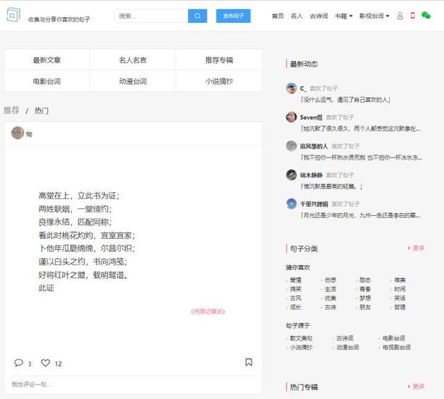 有时候文案可能就差那么一个画龙点睛的句,一般可以引用经典台词或是名人名言,不过广大网友的力量也是强大的,这个网站上有各种佳句,不论是辞藻华丽橘子、亦或是简约清新的风格都可以给文案人提供很好的素材,好的文案是非常有感染力的!