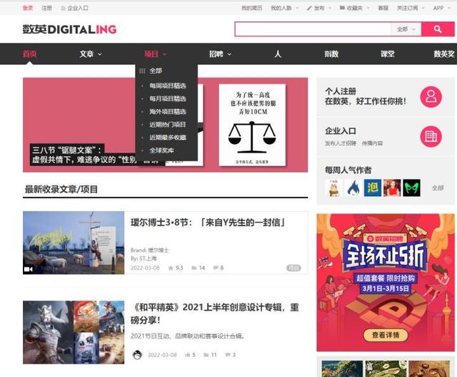 项目版块中可以查看各类项目案例以及活动创意,还有【海外】的分类,方便看到国外的优秀案例。