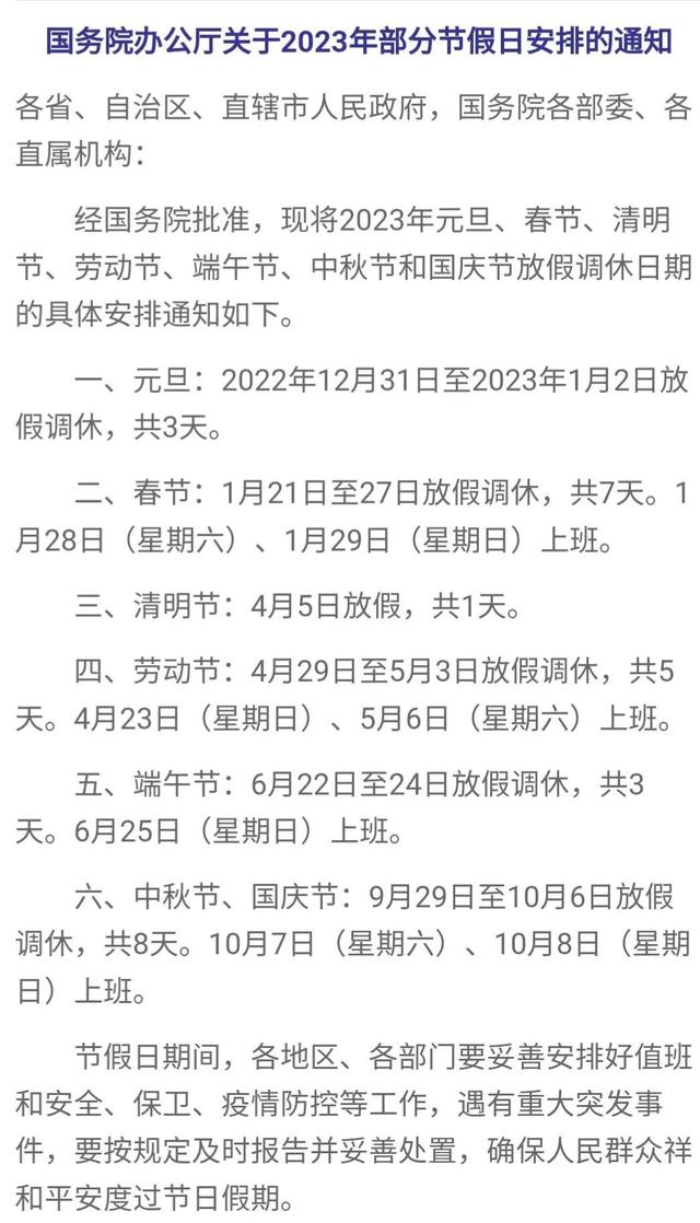 好消息!好消息!2023年节假日安排来了,今年春节,你可以安安心心,快快乐乐过大年了。