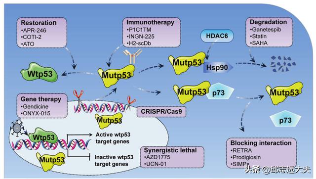 许多研究发现,干扰蛋白质相互作用、协同致死治疗、基因治疗和基因组编辑也可以用作靶向突变p53的治疗策略。