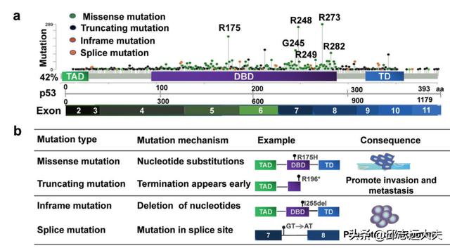 p53位于人17号染色体短臂(17p13.1),由11个外显子、10个内含子和393个氨基酸残基组成。p53蛋白是一种转录因子,通常分为三个功能区:氨基末端结构域、DNA结合域和羧基末端结构域。野生型p53(wt p53)通过调控多个靶基因的转录,在许多重要的生物学过程中发挥关键作用。然而,突变的p53不仅失去了wt p53的肿瘤抑制功能,而且还获得了促进恶性肿瘤进展的新功能。p53的主要突变类型包括错义突变、截断突变、框架内突变和剪接突变。错义突变导致单一氨基酸替换,在肿瘤发生过程中显示出功能增强的活性,例如促进肿瘤细胞侵袭和迁移的p53 R175H和R273H突变。截短突变会导致蛋白质截断,这也可以促进肿瘤的发展。例如,p53外显子6截断突变体R196*和R213*促进肿瘤细胞的增殖和转移。框架内突变由核苷酸的缺失或插入引起。剪接突变是由发生在剪接部位的突变引起的。因此,不同的p53突变类型是由不同的机制引起的,并有助于肿瘤的恶性发展(图1)。