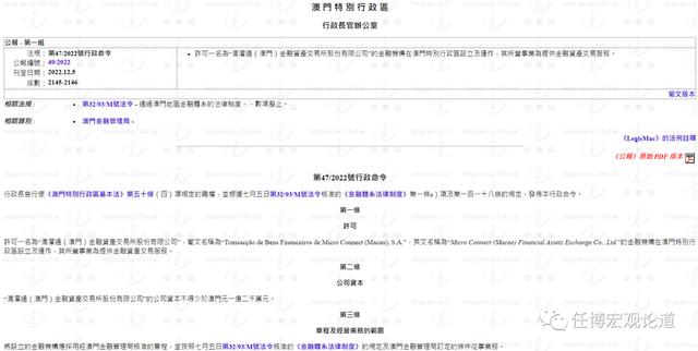 (一)2022年11月30日(12月5日公布),澳门行政长官发布第47/2022号行政命令,许可“滴灌通(澳门)金融资产交易所股份有限公司”(下称“滴灌通(澳门)金交所”)在澳门设立及运作,提供金融资产交易服务。