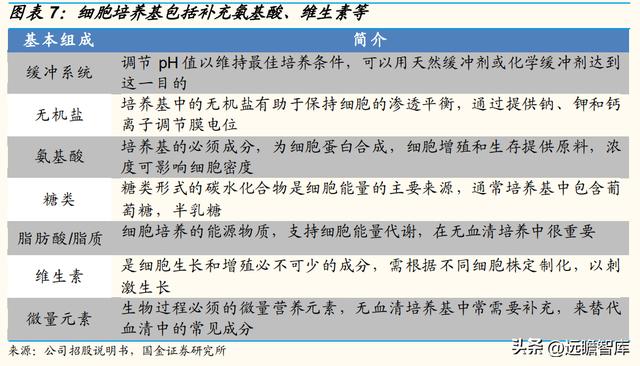 从基本组成看,典型的细胞培养基包括补充氨基酸、维生素、无机盐、葡萄糖和血清等,配方不同将直接影响细胞的理化特性。细胞培养基对细胞成长意义重大,可提供细胞营养成分、提供促生长因子及激素、调节渗透压、调节 pH 并提供无毒、无污染的细胞生长环境。