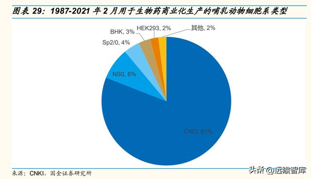 根据 CNKI,1987-2021 年 2 月用于生物药商业化生产的哺乳动物细胞系中,近 81%是使用 CHO 细胞生产的。