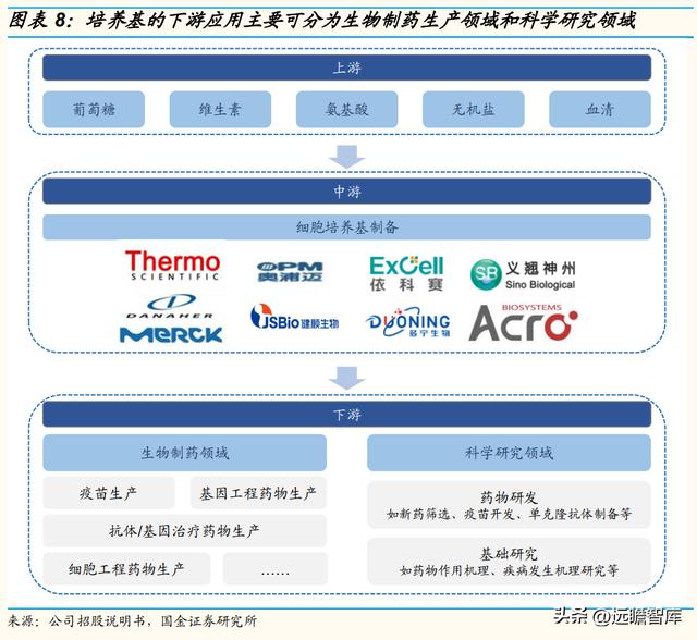 从产业链看,细胞培养基产业的上游为各类原料,中游是细胞培养基的制备。细胞培养基的下游应用十分广泛,主要可分为生物制药生产领域和科学研究领域两方面。