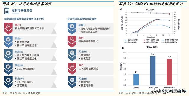 公司已向 50 多家客户准时交付定制培养基,能够在 3-6 个月内快速响应,交付高质量产品。如公司为客户针对 CHO-K1 细胞株定制开发培养基,与客户的原工艺相比,定制培养基能够显著提升活细胞密度(VCD)并保持相近的细胞活率(VIA),优化后抗体表达量提高 157%,产品质量与原工艺保持一致。
