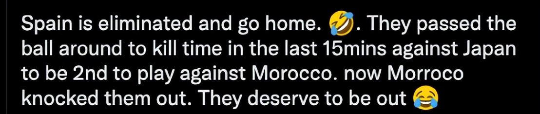 “西班牙队被淘汰回家了!在对阵日本队的小组赛中,他们在最后的15分钟以传球消磨时间,(本想)以小组第二在1/8淘汰赛对阵(实力较弱的)摩洛哥(就稳赢了)。现在摩洛哥击败了他们,这是他们自食恶果。”
