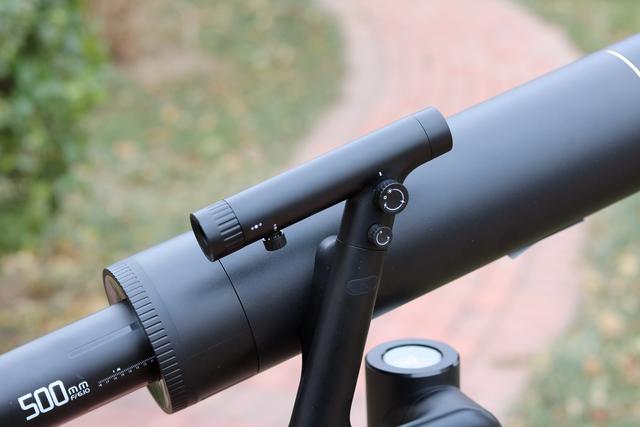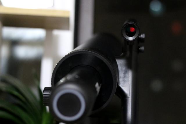 再来说一下这个红点寻星镜,它的主要作用就类似地标测量的标记系统一样,通过电池产生一个小红点,经过第一次使用校准后,用户再次观看星体或者物体时,只需要将寻星镜的红点对准物体中央,就能在望远镜里面看到了。简单来说就是这样的一个原理和过程,不需要用户盲目的通过目镜去费力的寻找目标。寻星镜上面有上下左右的微调旋钮,一个亮度调节/开关旋钮。具体的校准方法这里就不说了,第一次上手的用户可以参考一下说明书,也是很简单的。