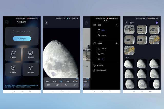 当当狸智能天文望远镜需要配合APP使用,下载安装后通过影像采集器内置的wifi进行连接。连接成功之后,就能在手机上同步显示观测的画面了。而且通过APP可以设定曝光、锐化、对比度、白平衡这些拍照参数,如果有一定的摄影基础,可以通过设定拍出更清晰的图片。设定界面里面还可以设置连拍、分辨率设定等内容。