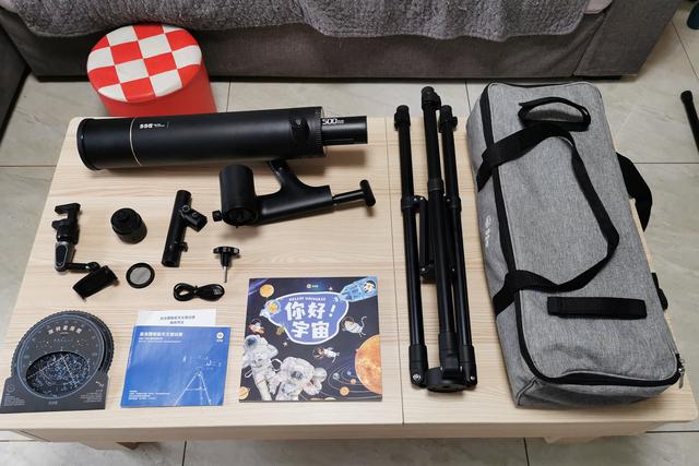 简单的看一下产品的开箱,当当狸智能天文望远镜采用三个硬纸礼盒方式包装,作为送给孩子的礼物来说还是很有意义的。打开盒子,将所有的物品全部拿出来,可以看到里面有主镜筒、三脚架、寻星镜、影像采集器、手机支架、太阳镜、寻星盘和一个手拿包。这个包的材质和做工感觉挺精致的,平时将望远镜、配件放在里面携带也比较方便。