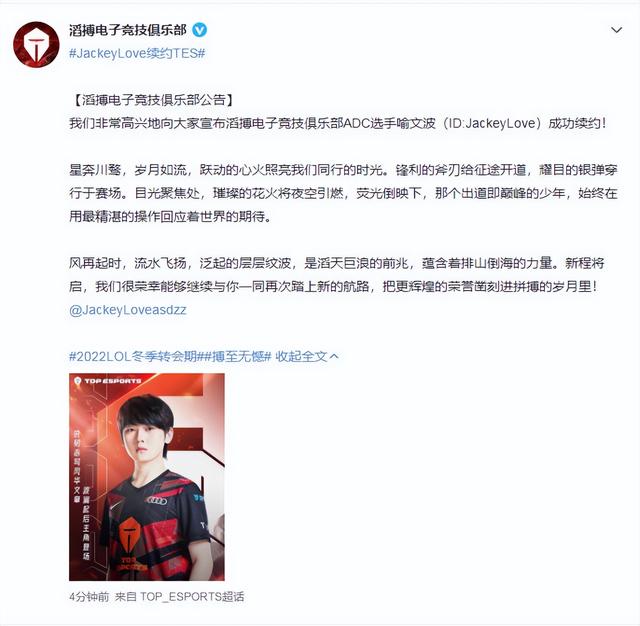 TES先在才宣布签约Jackeylove,并且是给的是AD位置的顶薪。在前几篇我也写过这件事,其实在22年LPL冬季转会期开启之前,TES就动作迅速续约了Jackeylove,现在TES的主力阵容有上单大黄Wayward、打野Tian、中单Rookie、AD阿水Jackeylove和辅助Mark。和去年相比,很难说TES的阵容到底是增强了还是变弱了。而Rookie和阿水再次联手能生出什么样的火花呢?新赛季希望两位选手加油!