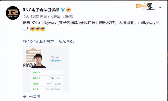最后提一下LPL的新人,RNG二队打野RYL战队的大野选手milkyway,最近在韩服愈战愈勇,以1581分的高分登顶韩服第一,RNG官方也发文庆贺。这难道是国产打野后继有人吗?不过对此也有水友表示RANK分高并不能代表什么,LPL从不缺天才少年,赛场考验的是选手间的配合能力,对此大家有什么想说的呢?
