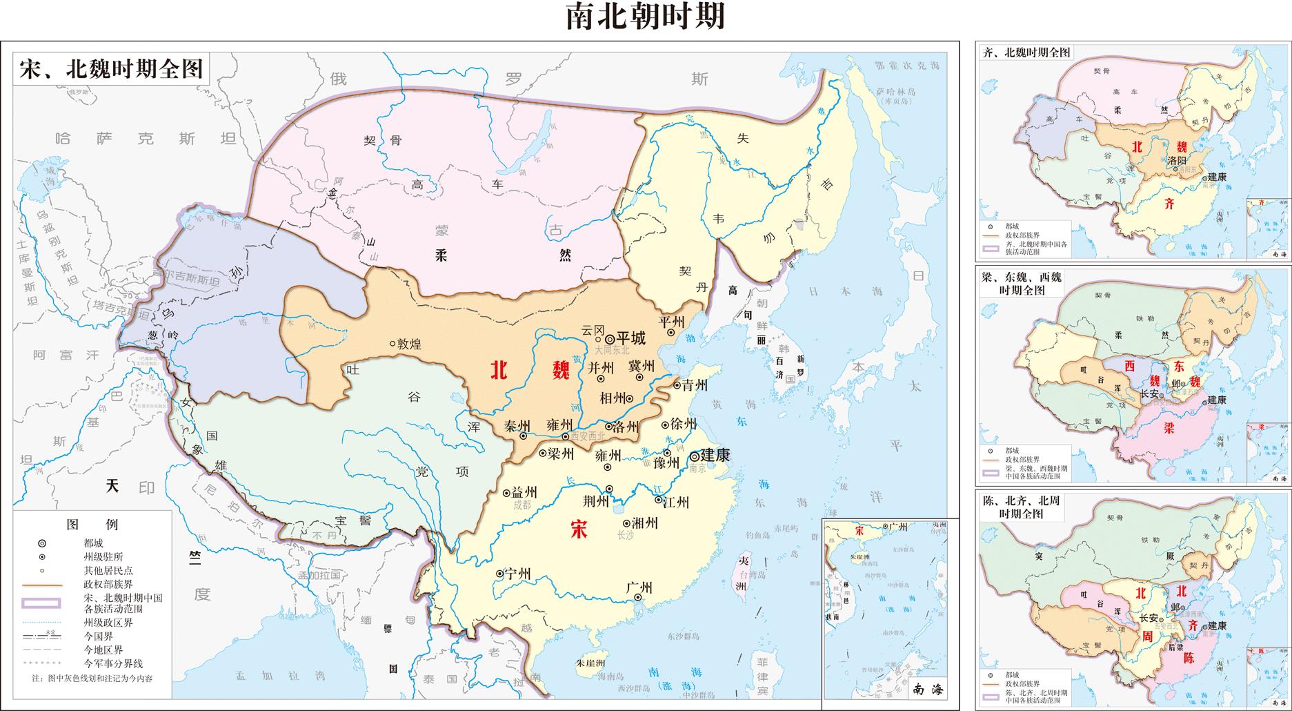 南朝:420年,宋武帝刘裕废除晋恭帝,建立刘宋~589年,共169年,南朝是继东晋之后,由汉族建立起来的王朝,在中国历史上有着极其重要的地位,为华夏文明的延续、发展和传播作出了不可磨灭的贡献。并且南朝时期的建康城和同时期的古罗马城并称为“世界古典文明两大中心”。