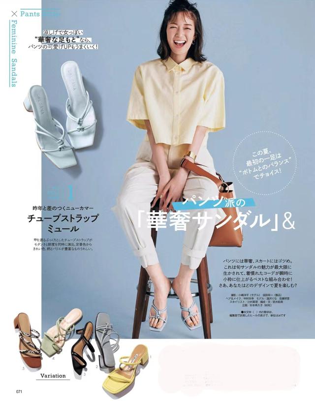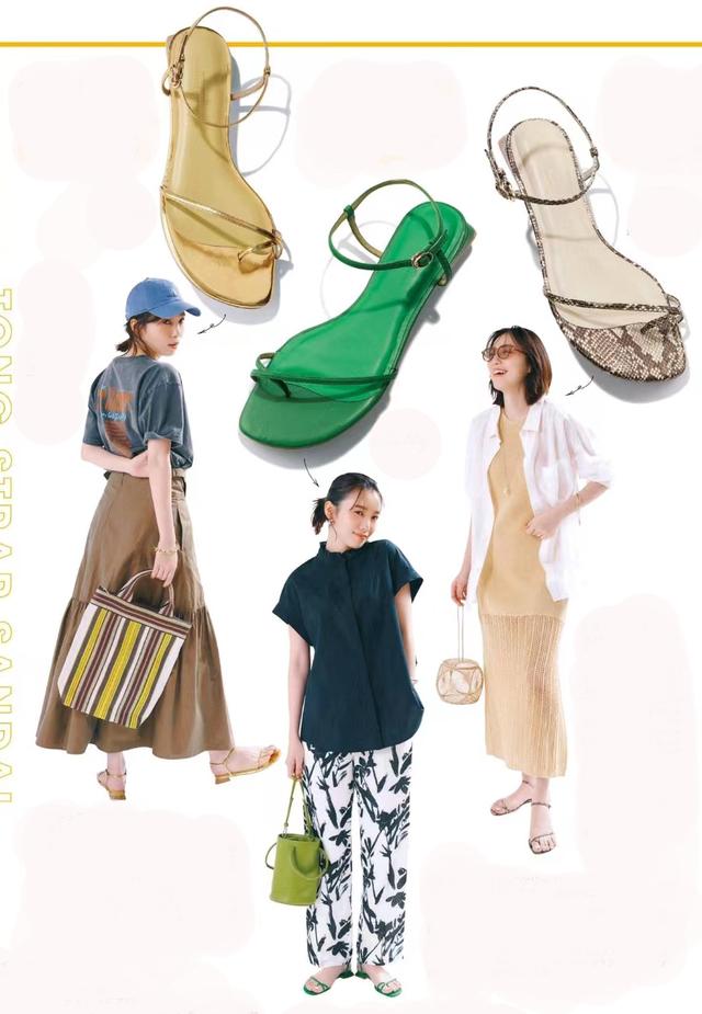 平底的“一字带”凉鞋,适合搭配各种连衣裙、半身裙。夏天如果穿牛仔裤,可以选择细高跟的款式,不仅看起来更轻盈透气,还能为整体穿搭增加几分优雅女人味。