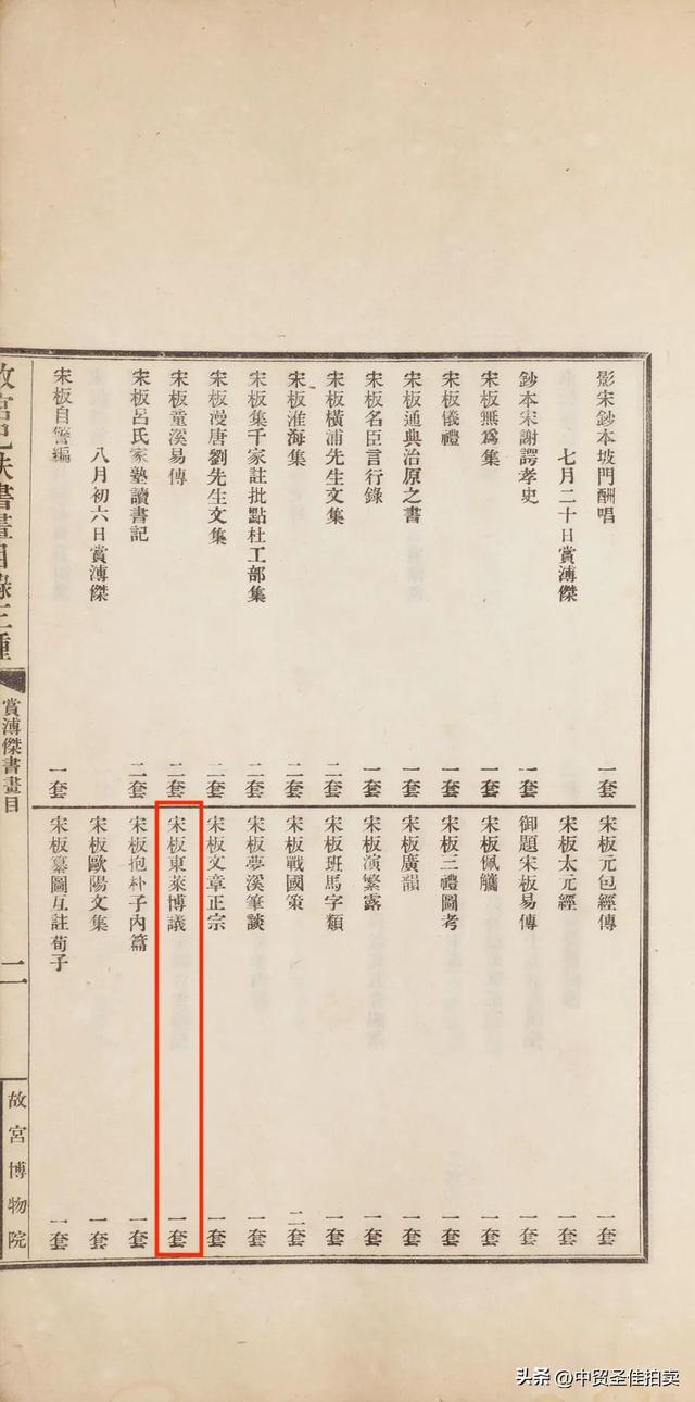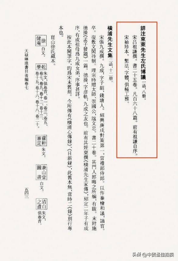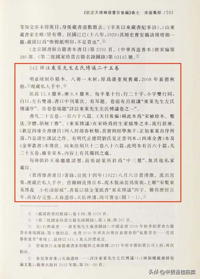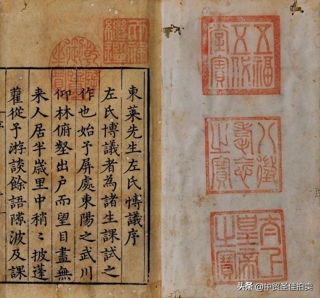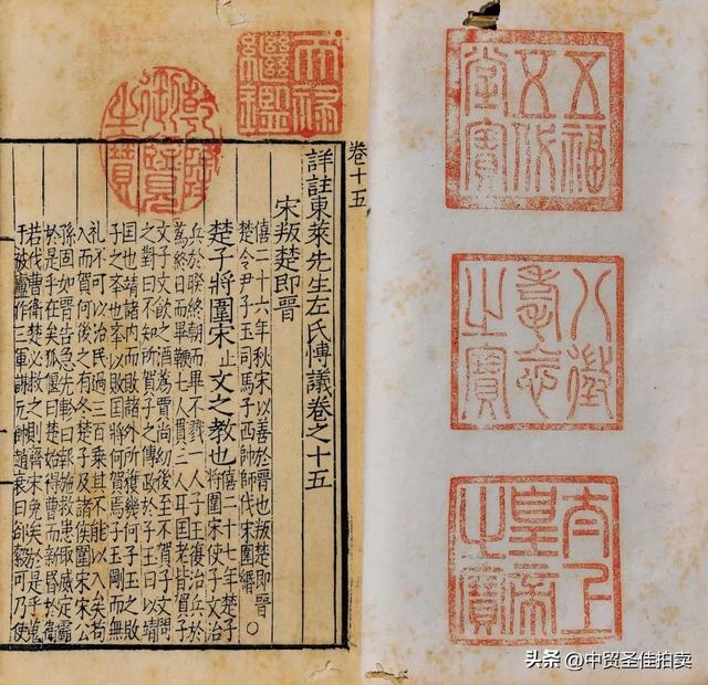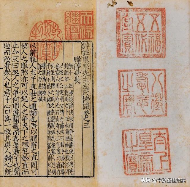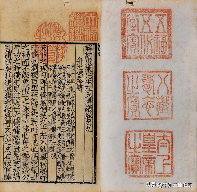自90年代有古籍拍卖以来,至今所出现的 36 部天禄琳琅藏书中首尾俱全的完本仅有9部,分别为清版《尚书详解》、清版《佩觿》、明版《六经图》、宋版《纂图互注扬子法言》、元版《孔丛子》、清版《帝学》、明版《详注东莱先生左氏博议》、明版《宋名臣言录》、明版《国语》。此部《详注东莱先生左氏博议》一匣八册,即为难得一见的完本。