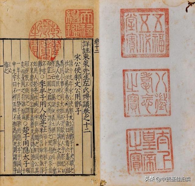 二十世纪二十年代初,废帝溥仪以赏赐为名,秘密将大内“天禄琳琅”的部分藏书盗运出宫。1925年,清室善后委员会点查故宫物品时,“天禄琳琅”藏书仅存三百一十一部。后来在懋勤殿、养心殿发现溥仪赏赐单,赏单内列宋元版书三百余部。1945年8月,日本战败投降前夕,溥仪仓皇出逃,留在伪满洲国皇宫小白楼的“天禄琳琅”藏书散落民间。为躲避日本侵略,民国政府将故宫国宝奇珍运往南京、上海、武汉、重庆等地,留在故宫的“天禄琳琅”藏书随往,现存台北故宫博物院。而今“天禄琳琅”藏书大部分藏于公馆,民间所藏已稀如星凤。据统计,自上世纪90年代以来,拍卖场上出现的天禄琳琅藏书中首尾俱全者仅有9部。此部《详注东莱先生左氏博议》便是其中之一,弥足珍贵。《详注东莱先生左氏博议》为宋吕祖谦(1137一1181)撰。吕祖谦,字伯恭,世称“东莱先生”,婺州 ( 今浙江金华 ) 人,南宋著名理学家、文学家。他所创立的“婺学”,是当时最具影响的学派,在理学发展史上占有重要地位,他与朱熹、张栻并称“东南三贤”, 并与朱熹合著《近思录》,著有《东莱集》《历代制度详说》《东莱博议》等。此书专就《左传》某些史实进行广泛的议论,序中有言:“《左氏博议》者,为诸生课试之作也。”南宋至晚清期间,该书一直是士子科举考试(策论等)范文,流传颇广。