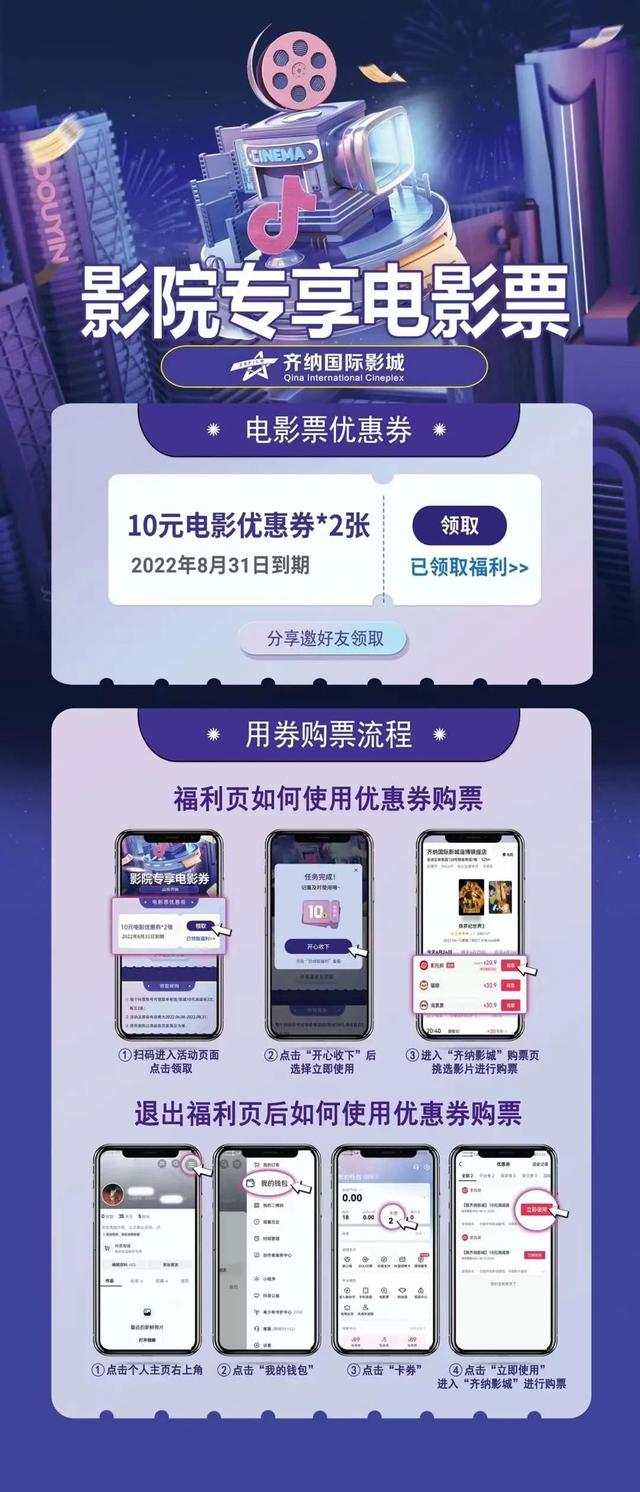 领取齐纳影城2张10元满减