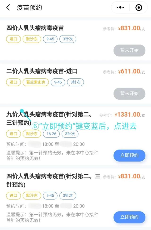 第六步,预约。 找到预约九价的选项,“立即预约”键变蓝表示可预约,按键呈灰色表示不可预约。在按键变蓝的时候点进去。