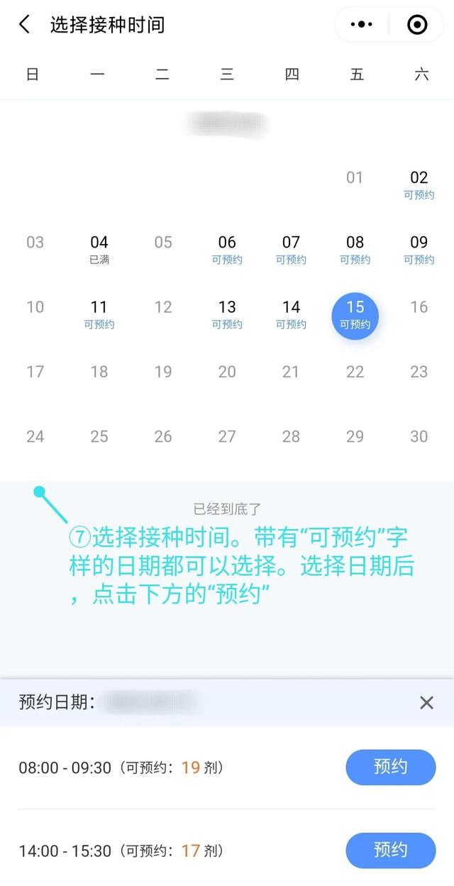 第七步,选择接种日期。 下方带有可预约字样的日期都可以选择。选择日期后,点击页面下方“预约”。