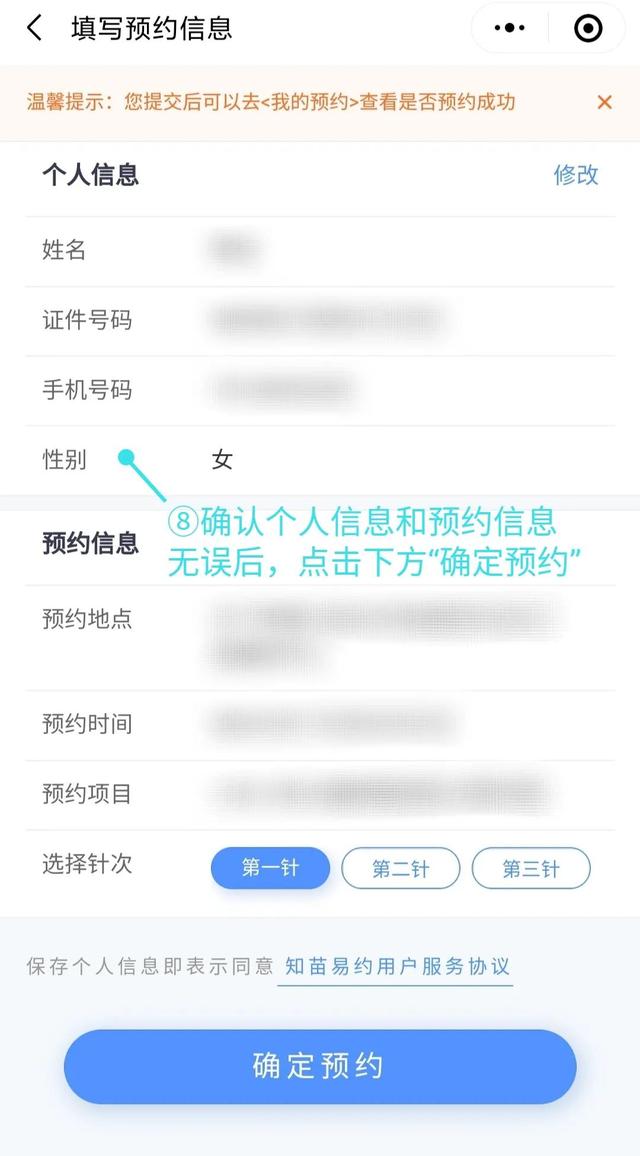 第八步,确认信息。 确认个人信息和预约信息无误后,点击下方“确定预约”。假如能够确保第四步完善个人信息不会出错的话,可以直接点击下方“确定预约”,不需要核对。