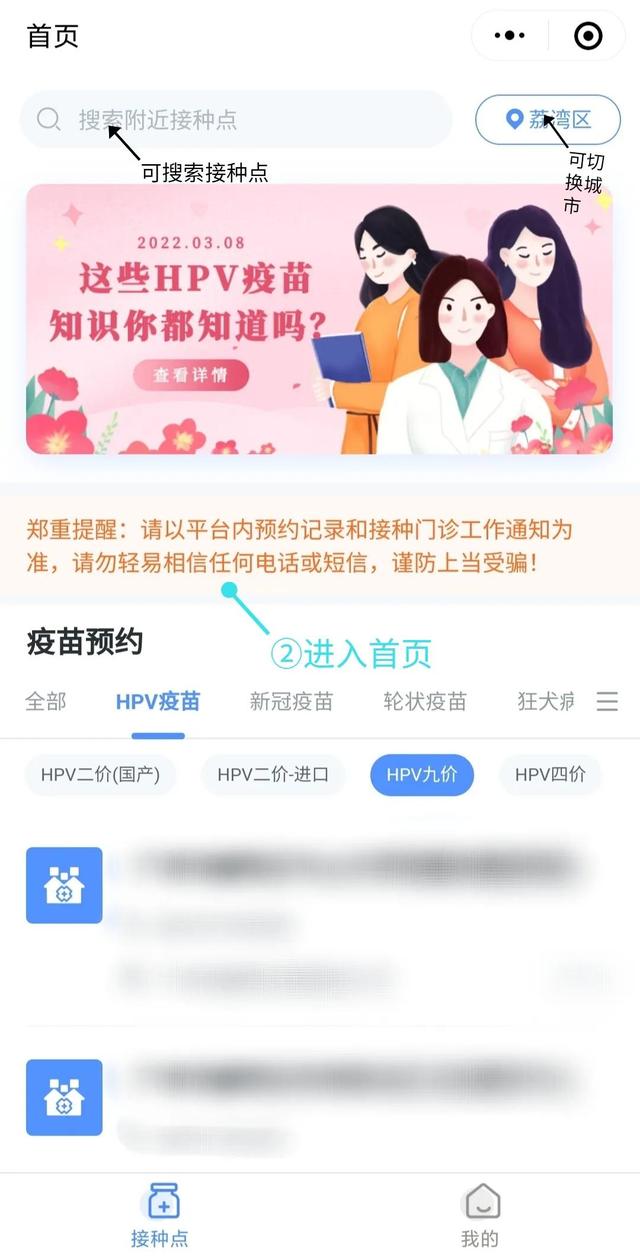 第二步,进入首页。 一般小程序会帮你定位到当前位置。如果需要切换接种城市,可以在页面右上角切换接种城市,或者直接在页面上方搜索具体接种点名称。