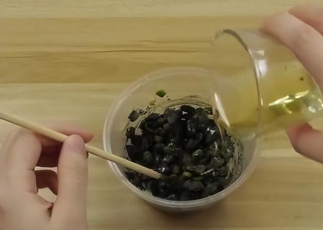 然后再倒入一些香油,将他们搅拌均匀。(水泥和油是不会混合的)