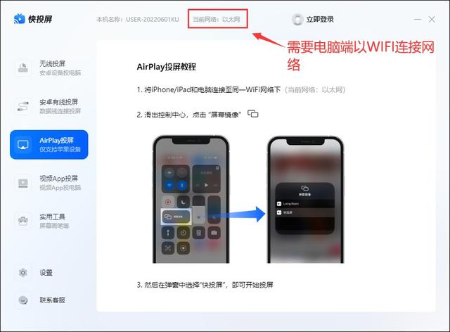 操作要点四:如果电脑设备是网线连接,则会在页面上方显示“以太网”,这时是无法完成dlna投屏的,后续在苹果手机的“屏幕镜像”功能中选择快投屏即可。