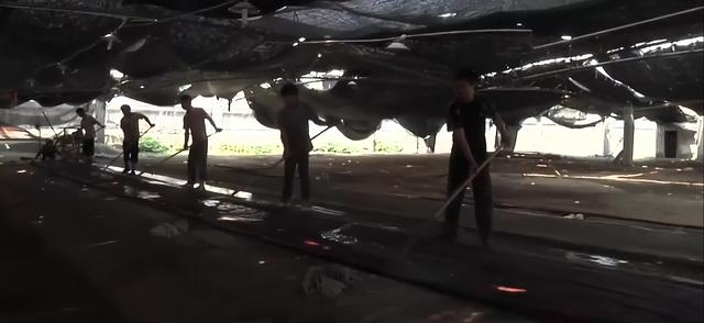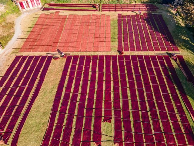 榨取薯莨的汁,过滤杂质,工人将丝绸浸泡在汁液中,用手拍打使丝绸均匀上色,之后打开、拉平放到草地上,用木桩固定住,开始晾晒工序。之所以在草地上晾晒,是因为草地柔软还有一定的支撑力,这样面料不直接接触地面,还可对面料具有一定的保护力。一个面料要这样反反复复染色30多遍,每次要晒干后再染色,而且每次的薯莨汁的浓度都不同,只有经验老道的师傅才能做到。香云纱也是靠天开晒的,要阳光充足,温度适宜才能染出质量好的纱。