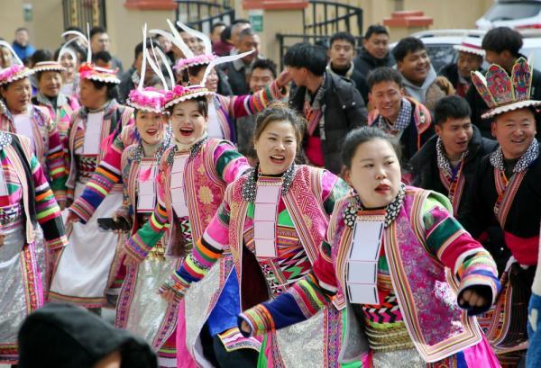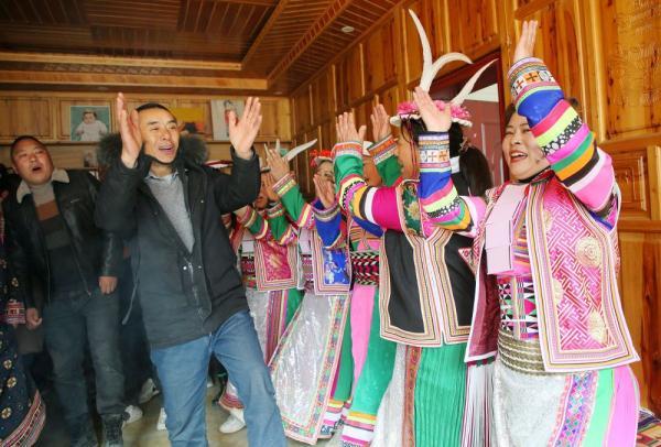 平武县白马藏族乡伊瓦岱惹村的村民们挨家逐户跳“曹盖”唱山歌拜年。(胡宇摄)