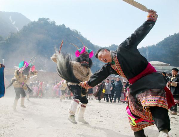 平武县白马藏族乡伊瓦岱惹村的村民们身着传统服饰,头戴曹盖面具,用当地传统的“曹盖舞”迎接新春。(胡宇摄)