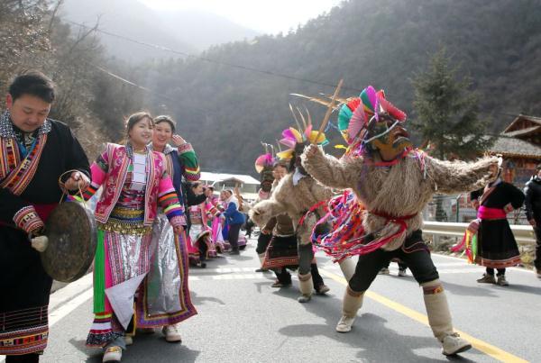 据了解,每年春节,白马藏族乡各个村寨都要举行隆重的过年民俗活动,届时锣鼓声、山歌声、欢笑声、鞭炮声响彻山谷。从正月初五开始,当地跳“曹盖”的队伍要挨家挨户唱跳拜年,随后全村人汇聚一堂围着篝火跳舞,场面古朴豪放,充满浓厚的人文色彩。(完)
