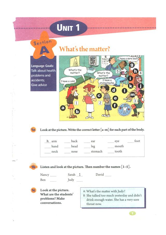 S: He/She has a cold/stomache/sore throat/fever/ toothache/ headache/ cough/ sore back/sore neck/ cut himself.