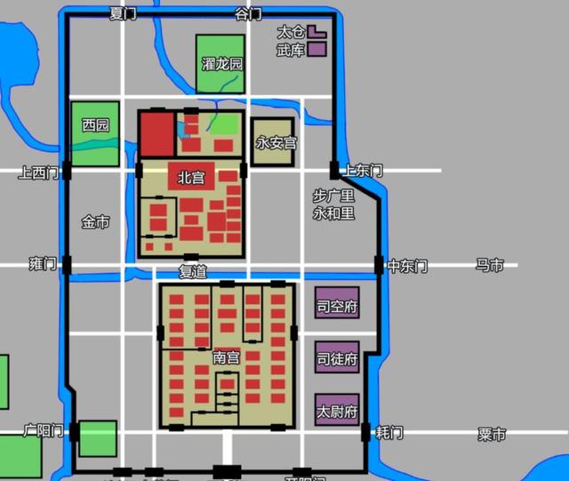 根据史书记载和考古发现,东汉洛阳城的宫城(皇帝居住的建筑群)分为南宫和北宫。南宫是光武帝刘秀修建的,而北宫是东汉第二位皇帝汉明帝刘庄修建的。东汉的洛阳南北宫仿照了西汉长安东西两宫,是互为备份的建筑群,因此洛阳南北宫的整体格局几乎一模一样。