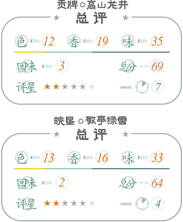 生津回甘上看龙井茶也表现的更突出,总体领先。但在喉韵与茶气上敬亭绿雪有优势。