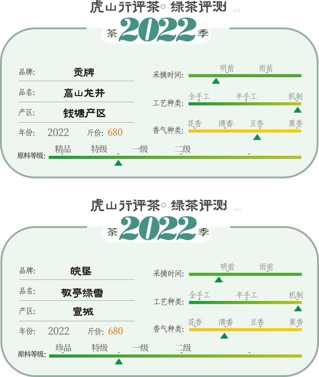 以其他绿茶为标准价位选取同价位的龙井茶,本次价位在700左右,由此代表龙井茶口感的是贡牌高山龙井,代表敬亭绿雪的是皖垦出品的敬亭绿雪。