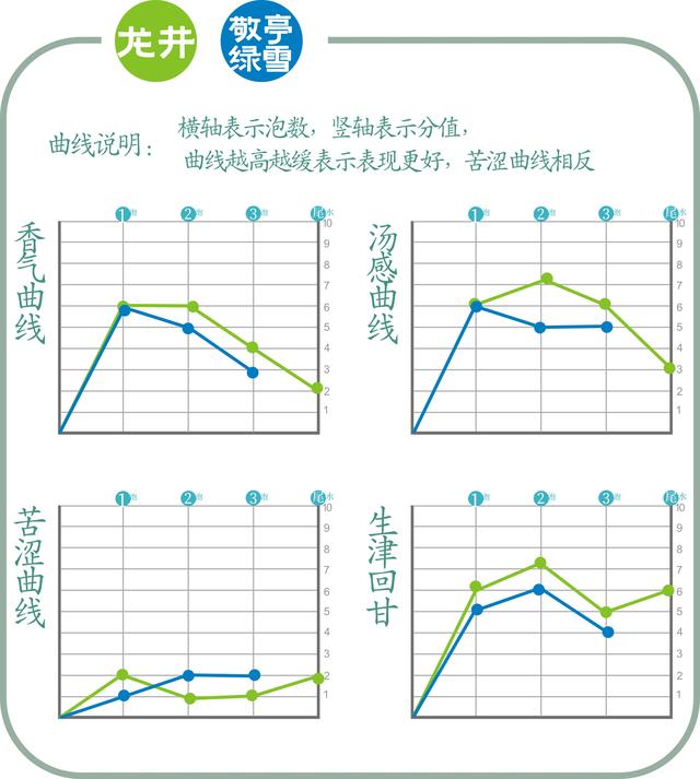 苦涩曲线可见两者在同一水平线上,龙井中段的苦涩控制稍好。