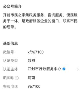 记者注意到,该公众号的认证为“开封市行政服务中心”,并且该公众号表示开封市民之家集政务服务、咨询服务、便民服务于一体,是政府服务企业的窗口、联系市民的纽带。
