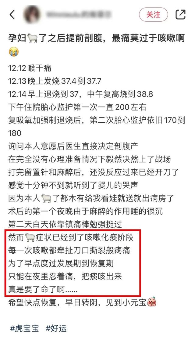 社交平台上,一些跟燕琼一样顶着新冠剖宫产的孕妈哭诉,咳嗽牵扯到刀口撕裂般疼痛,几乎要了老命。