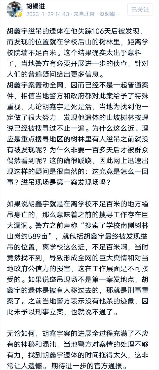 胡锡进更是一针见血地说:为什么这么近非要一百多天后才被群众偶然看到呢?缢吊现场是第一案发现场吗?如果胡鑫宇的遗体是被有人移过去的,那就是刑事重案了。之前当地警方表示没有他杀的迹象,因此未予以刑事立案,也就说不通了。
