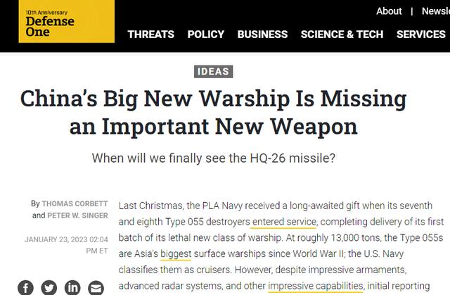美媒报道称,去年圣诞节前后,当第七艘和第八艘055型驱逐舰服役时,意味着中国海军完成了首批该型战舰的交付。055型驱逐舰排水量约13000吨,是二战以来亚洲最大的水面战舰,美国海军甚至将其归类为巡洋舰。“然而,尽管拥有令人印象深刻的武器装备、先进的雷达系统和其他强大作战能力,但初步报告显示,055型似乎缺少一种关键武器:计划已久的下一代舰空导弹。”
