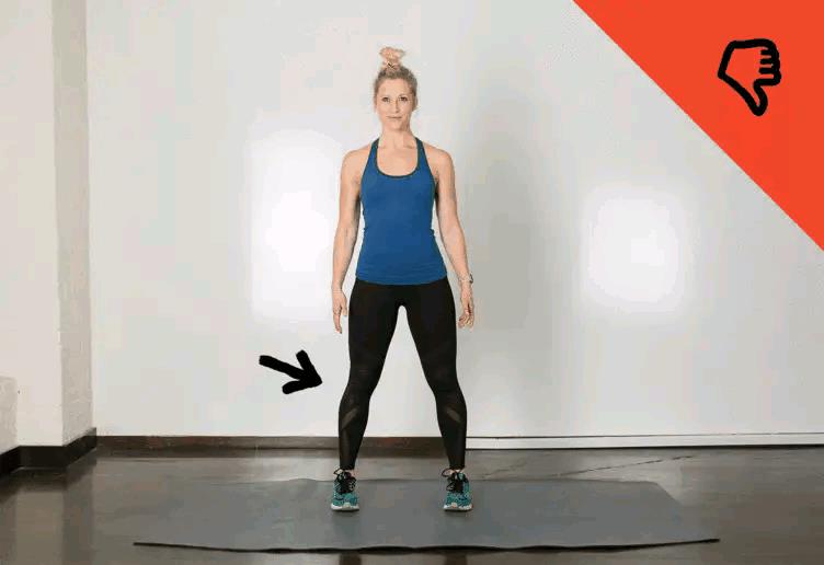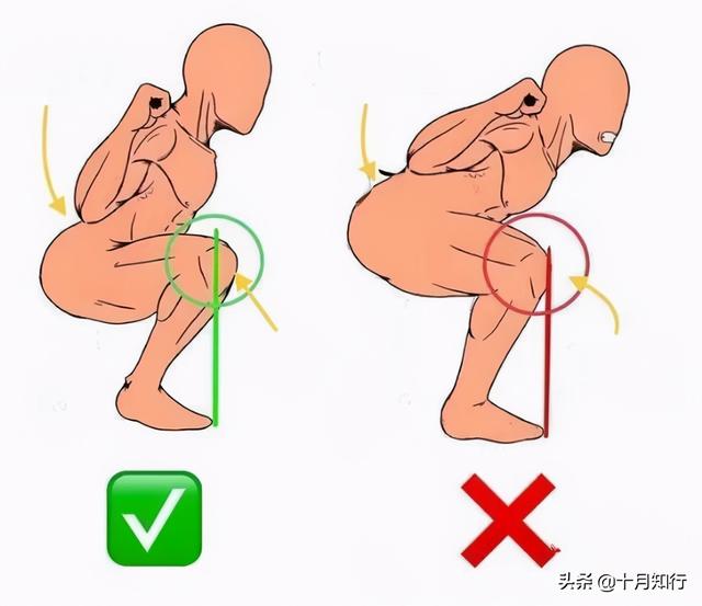 在不熟悉动作要领的前提下去做这个动作的话,我们会习惯性地屈膝下蹲而忽视了髋部动作,在深蹲过程中我们会要求有一个屈髋的动作,也就是臀部向后坐并屈膝下蹲,如果直接屈膝下蹲,膝关节就会向前推,此时为了让身体保持稳定,就会不自觉地踮起脚尖,这样就会使得膝关节承受过多的压力而增加受伤的风险。