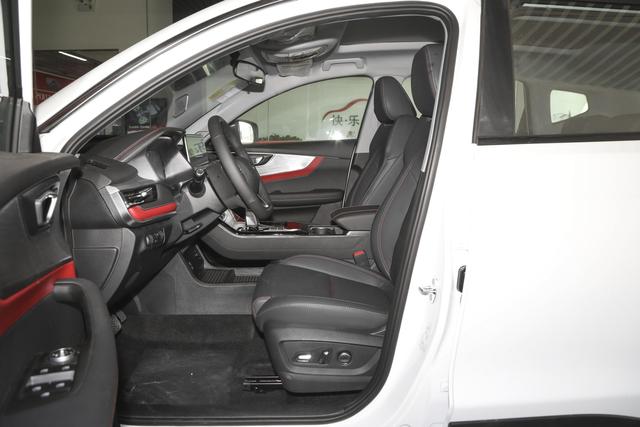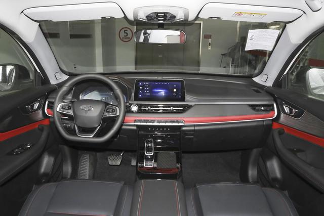 进入到前排,中控台采用标准的T字型设计,中控台大面积使用软质材料覆盖,驾驶舱周围用红色饰条点缀,与车身底部红色饰条相互呼应着。