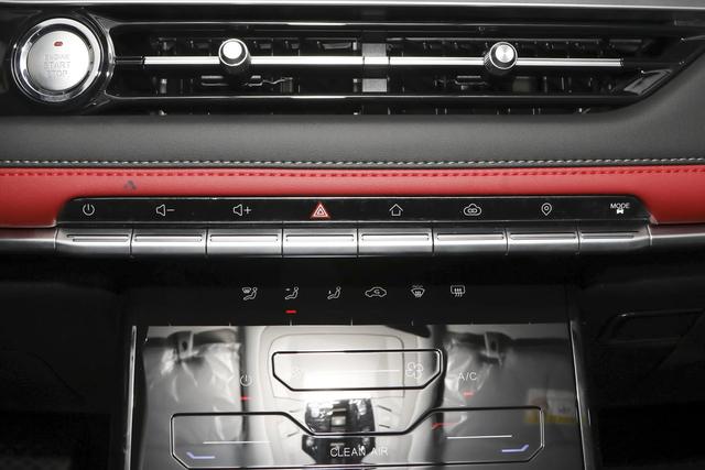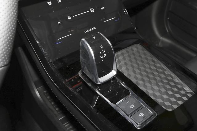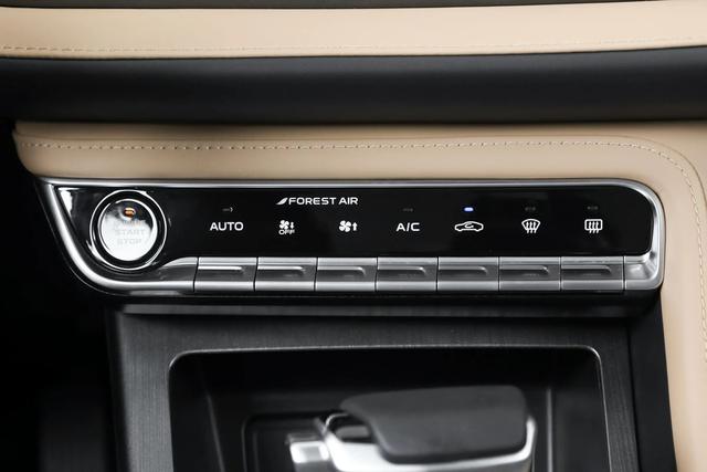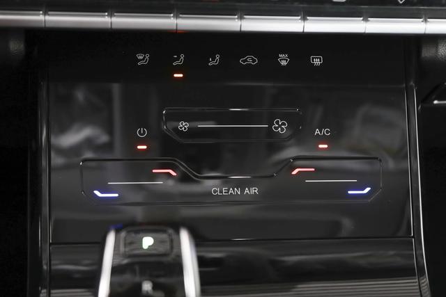 中控屏下方配有实体按键,上面没有镀铬工艺,看着有些廉价,用手指触控按键,防滑效果和反馈力度都不错,从左到右依次是温度调节、自动空调开关、风向调节、内外循环、风挡除霜、风挡加热/外后视镜加热等等。