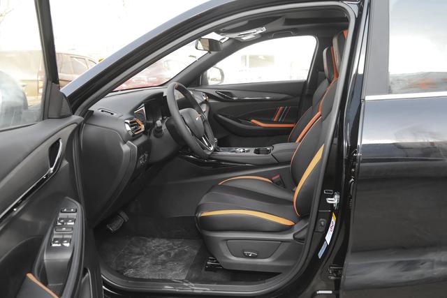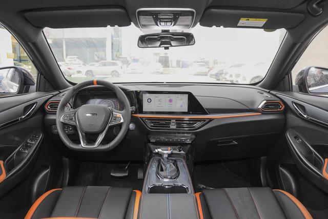 进入到前排,中控区域功能布局规整,上手操作时较为便利。两侧出风口、中控饰条、座椅边缘、方向盘12点钟方向,均有橙色饰件点缀,与车身外观橙色饰件相互呼应着。
